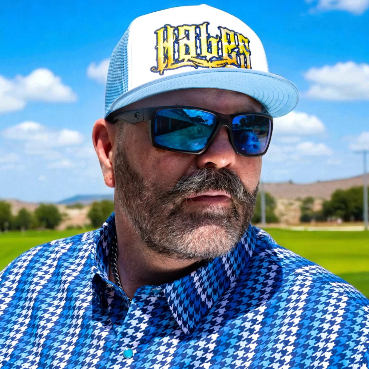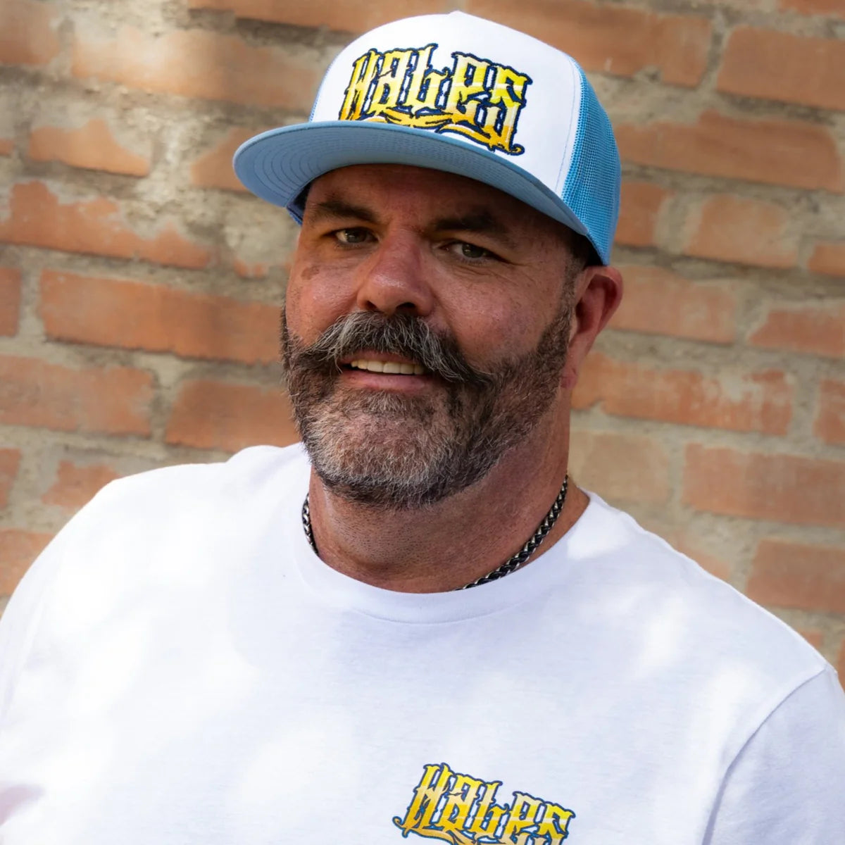 Clean, bold, and ready to raise hell. The Cheyenne Flat Bill Trucker Hat takes its cue from vintage Chevy grit and backyard party swagger. With a two-tone Carolina Blue and White colorway, high-profile fit, and embroidered Hales in our “Cheyenne” font front and center, this lid was made for legends who know their way around a tailgate and a tee box.