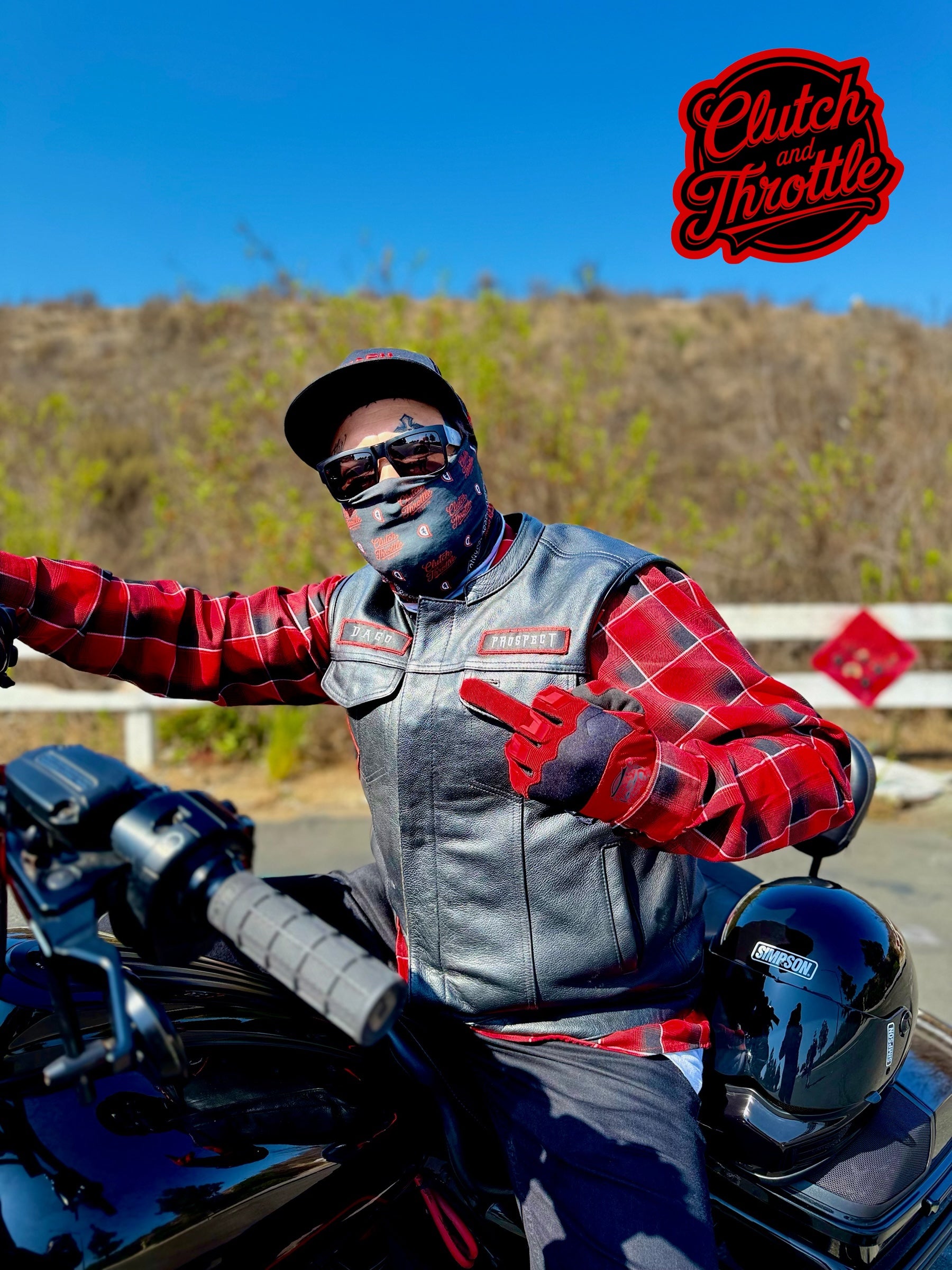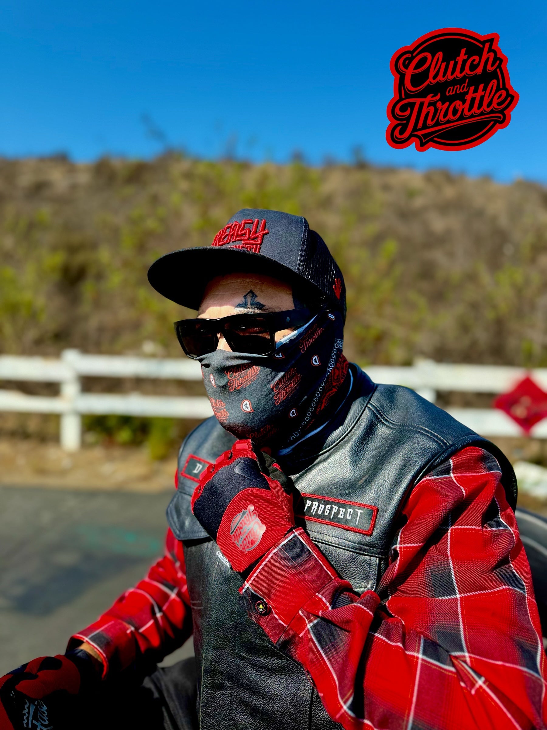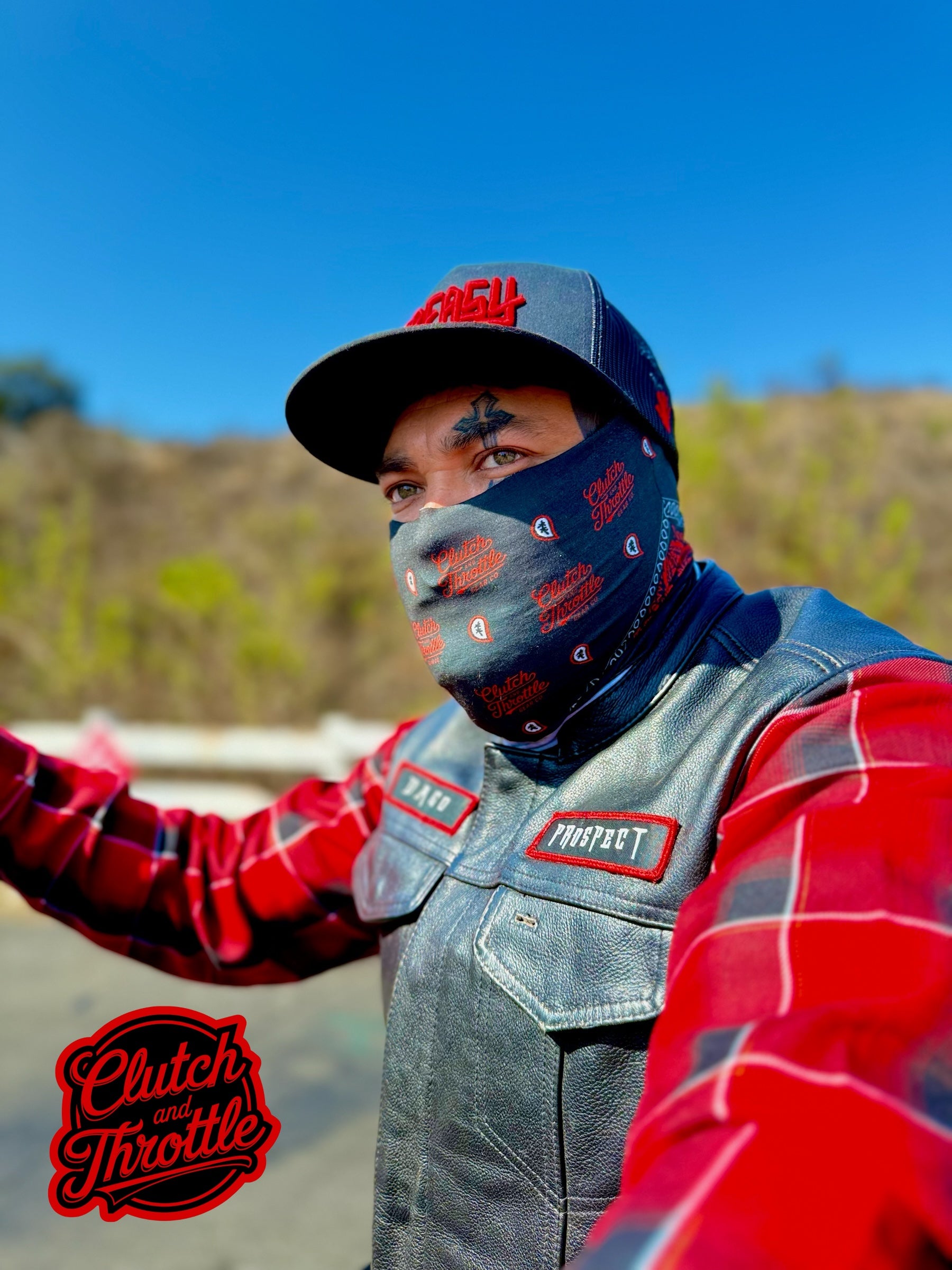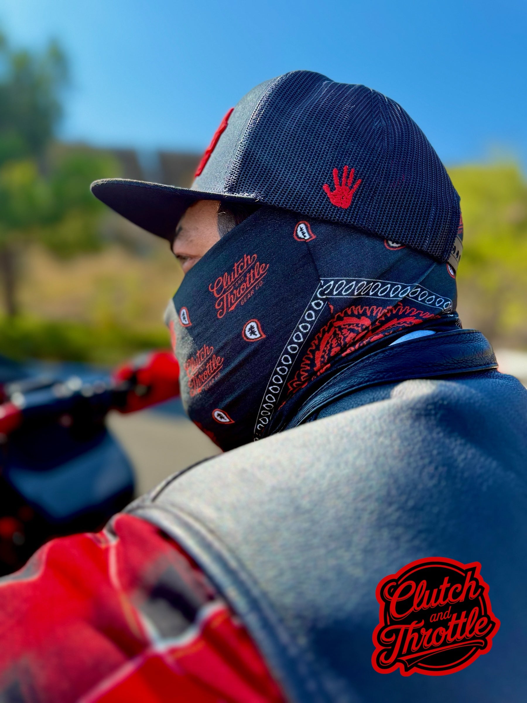 Protect your face with our Classic Script Paisley neck gaiter. This is the perfect face covering when riding with a half-shell and shades!