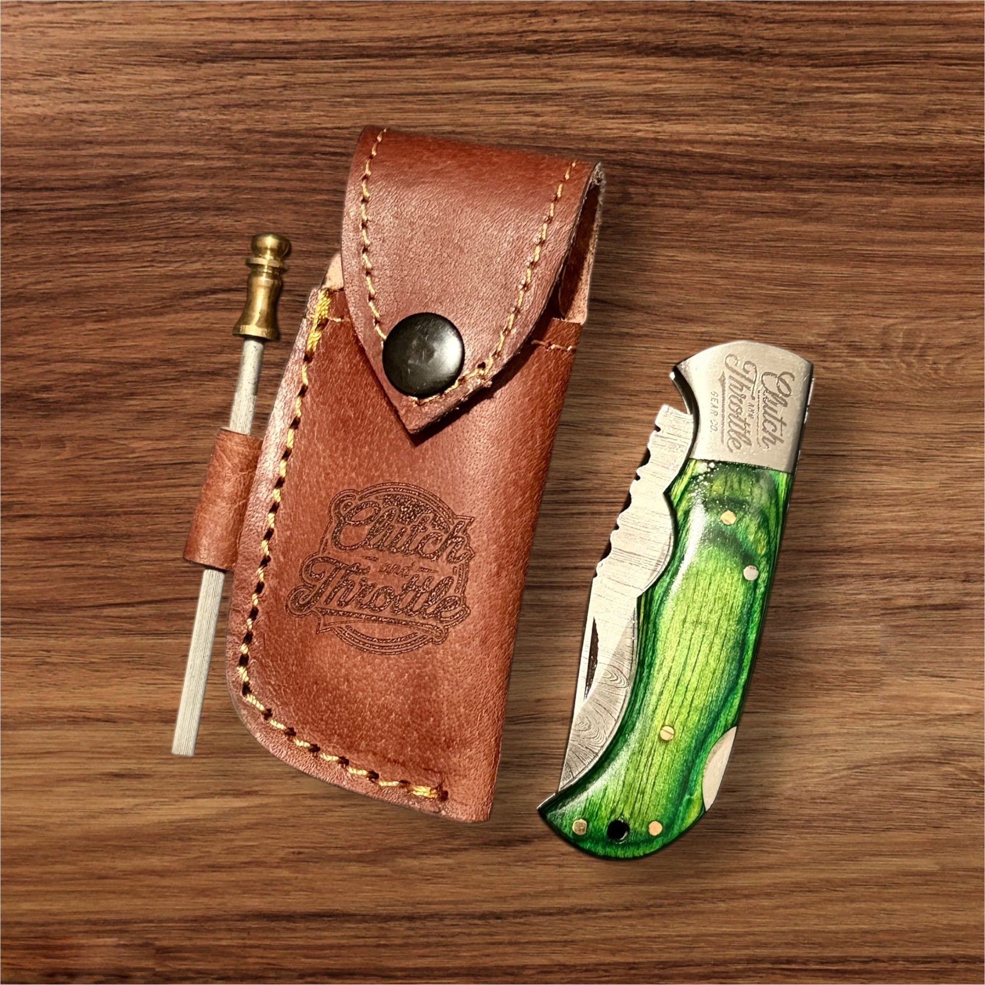 - Includes premium leather pouch and sharpener