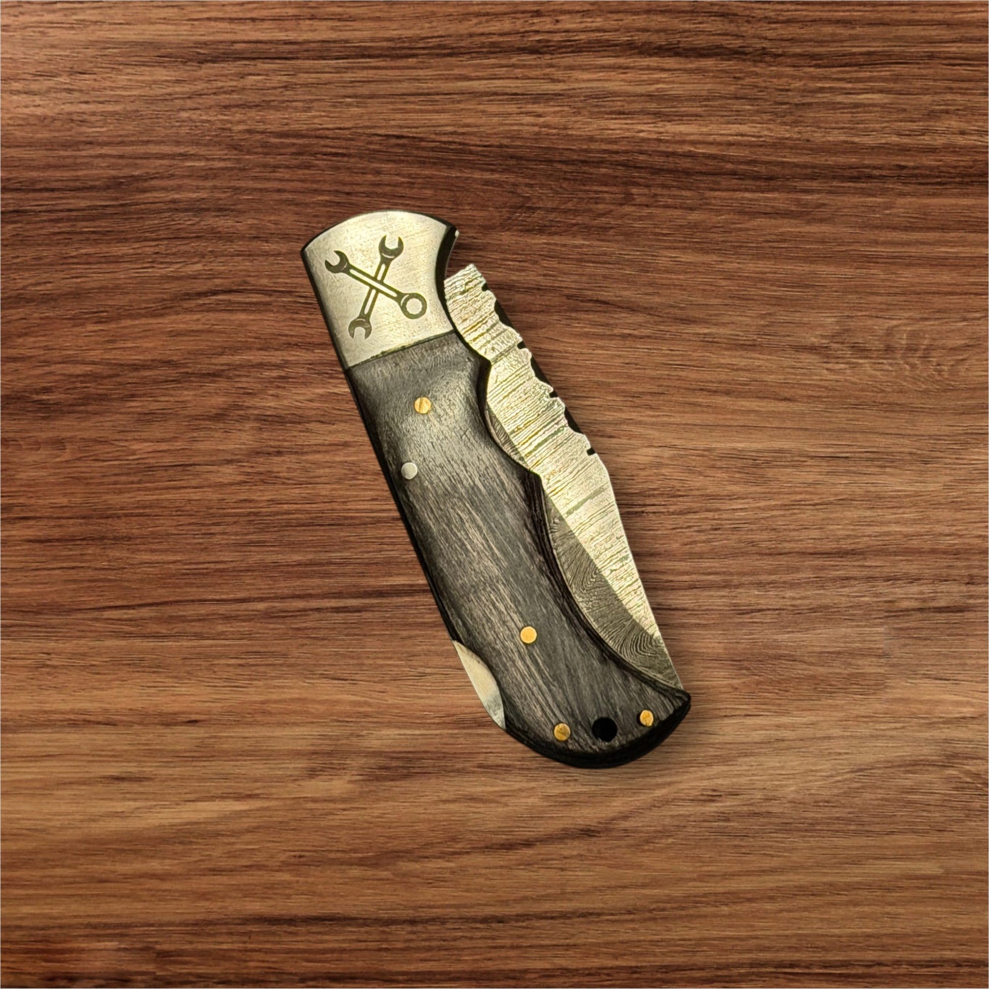 - Modern Script and Crossed Wrench logo engraved
