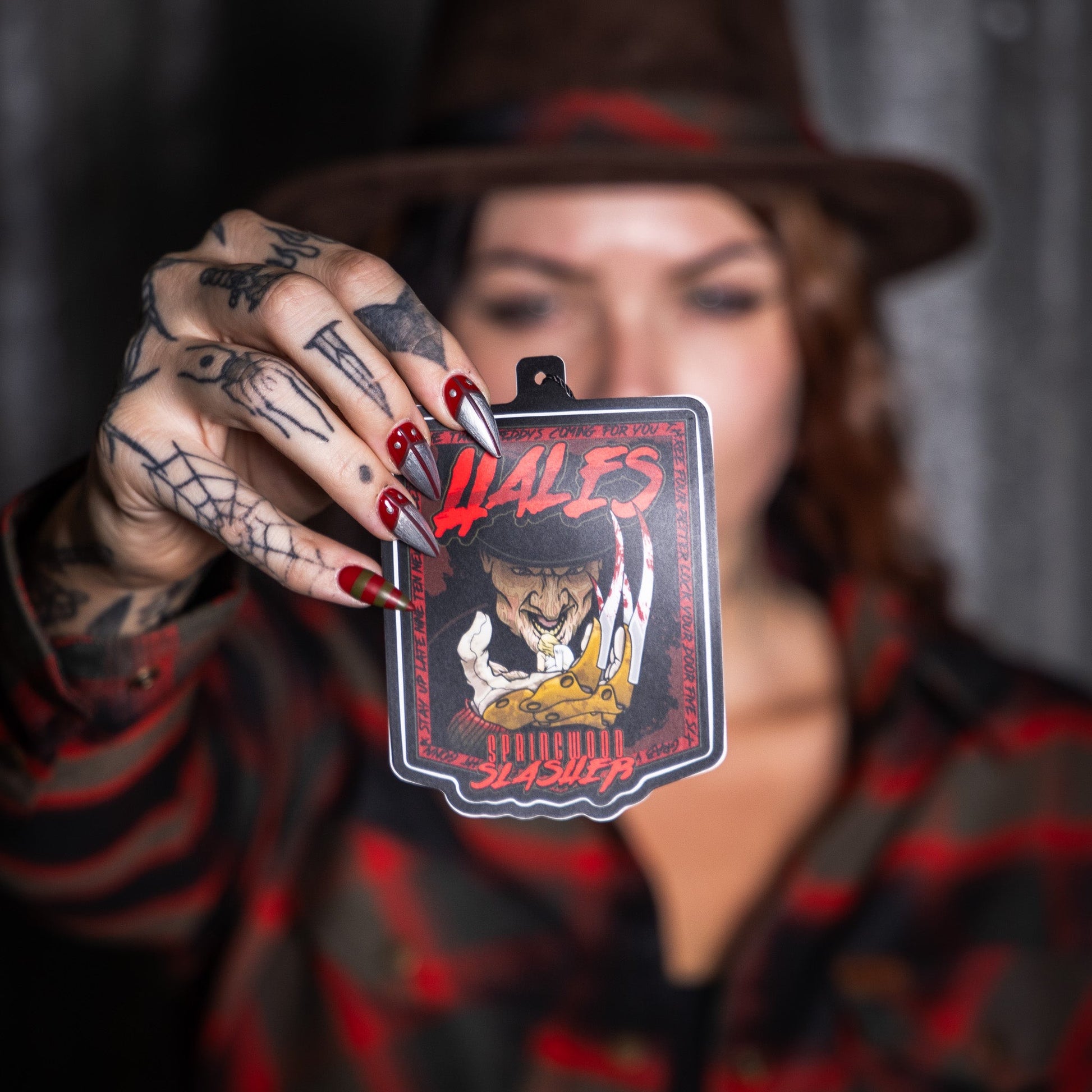 The Springwood Slasher Women’s Flannel was built for the bold. A complex 5-color plaid of black, blood-red, and nightmare olive drab green — sharpened with hidden tones that, from a distance, mimic Freddy’s iconic striped sweater. Straight from Elm Street, this flannel channels the nightmare into a look made for women who don’t play scared.