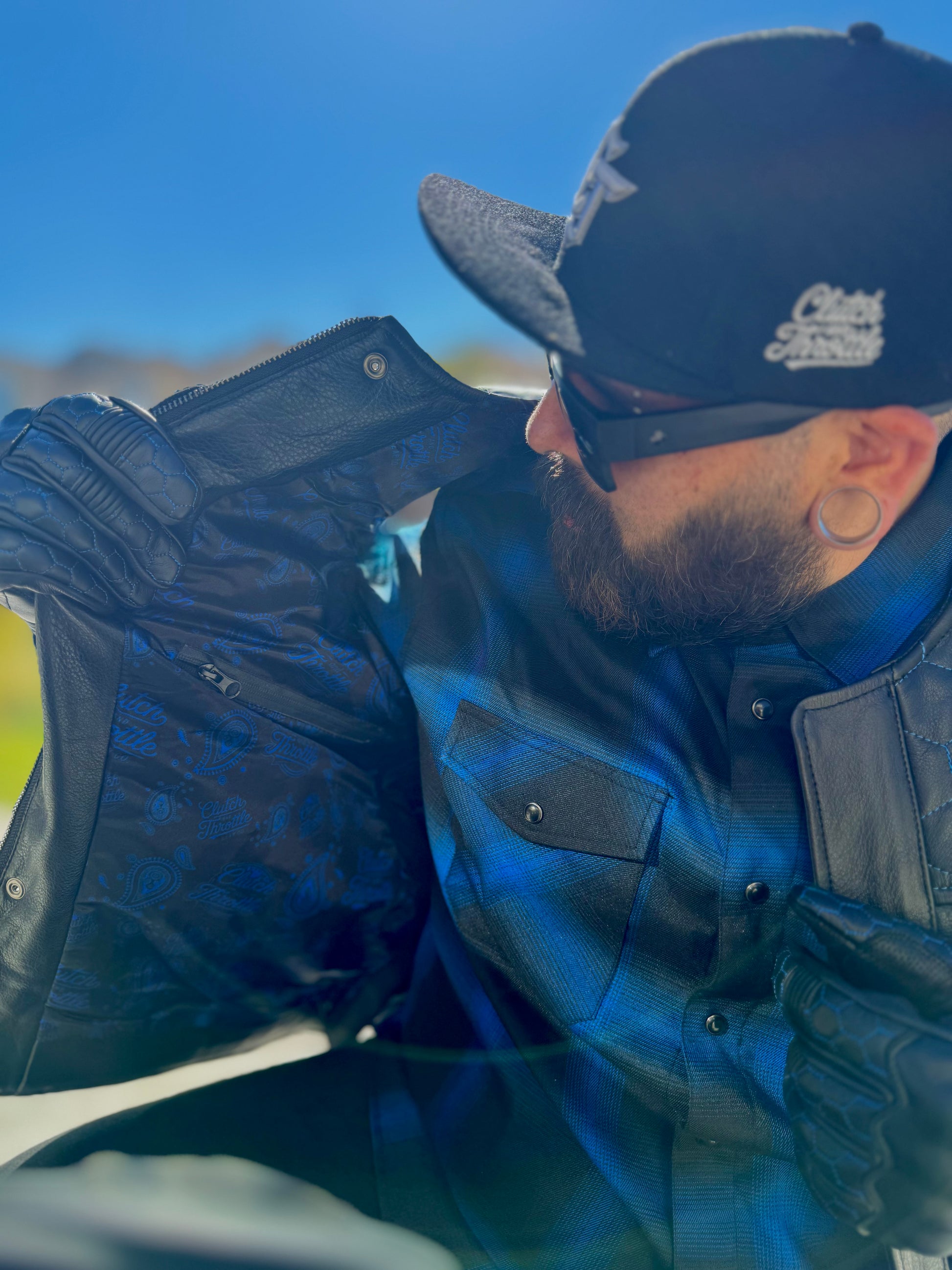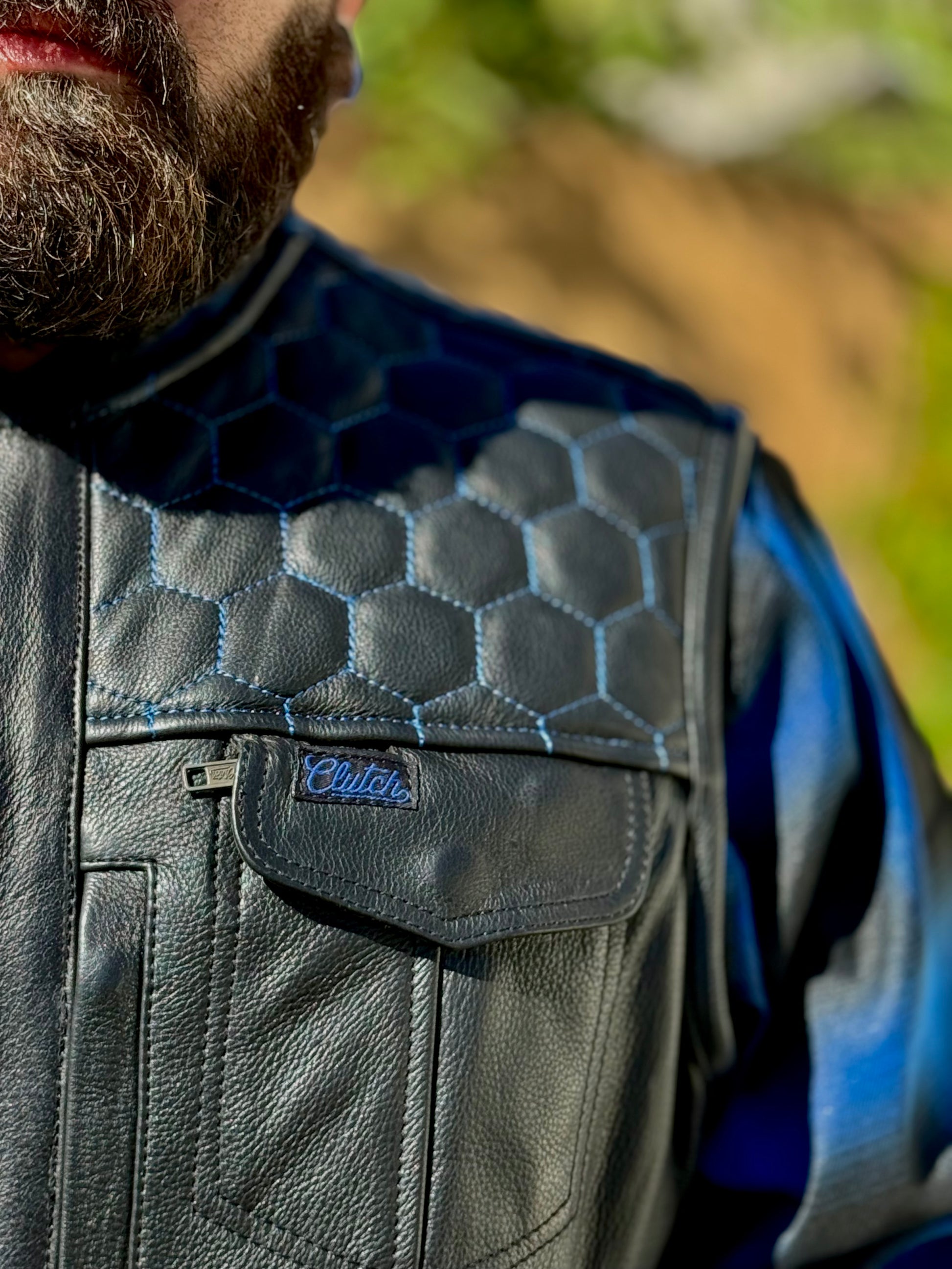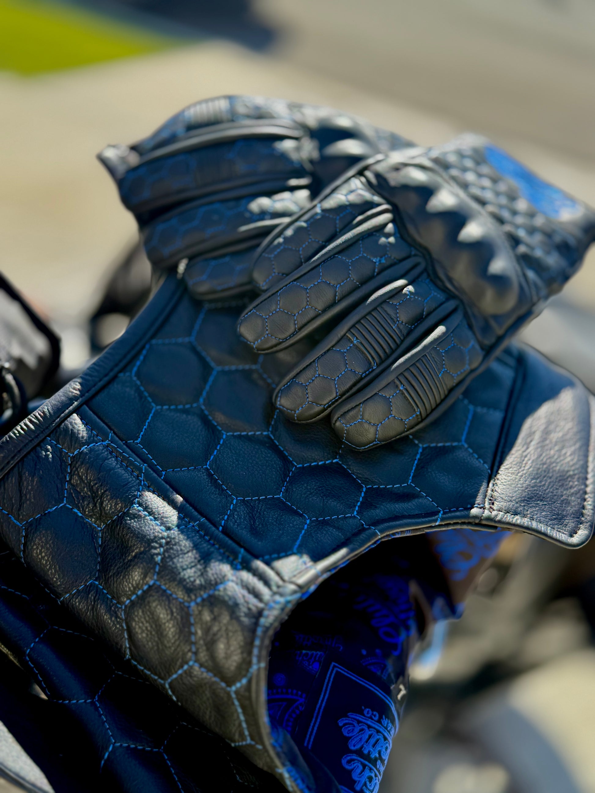 Ride the streets in the LARGE Azul Hornet Leather Vest and Glove set. Vest is lined with black interior and stamped with blue Clutch and Throttle logos alongside a paisley print. Blue honeycomb stitching stands out at any bike function!