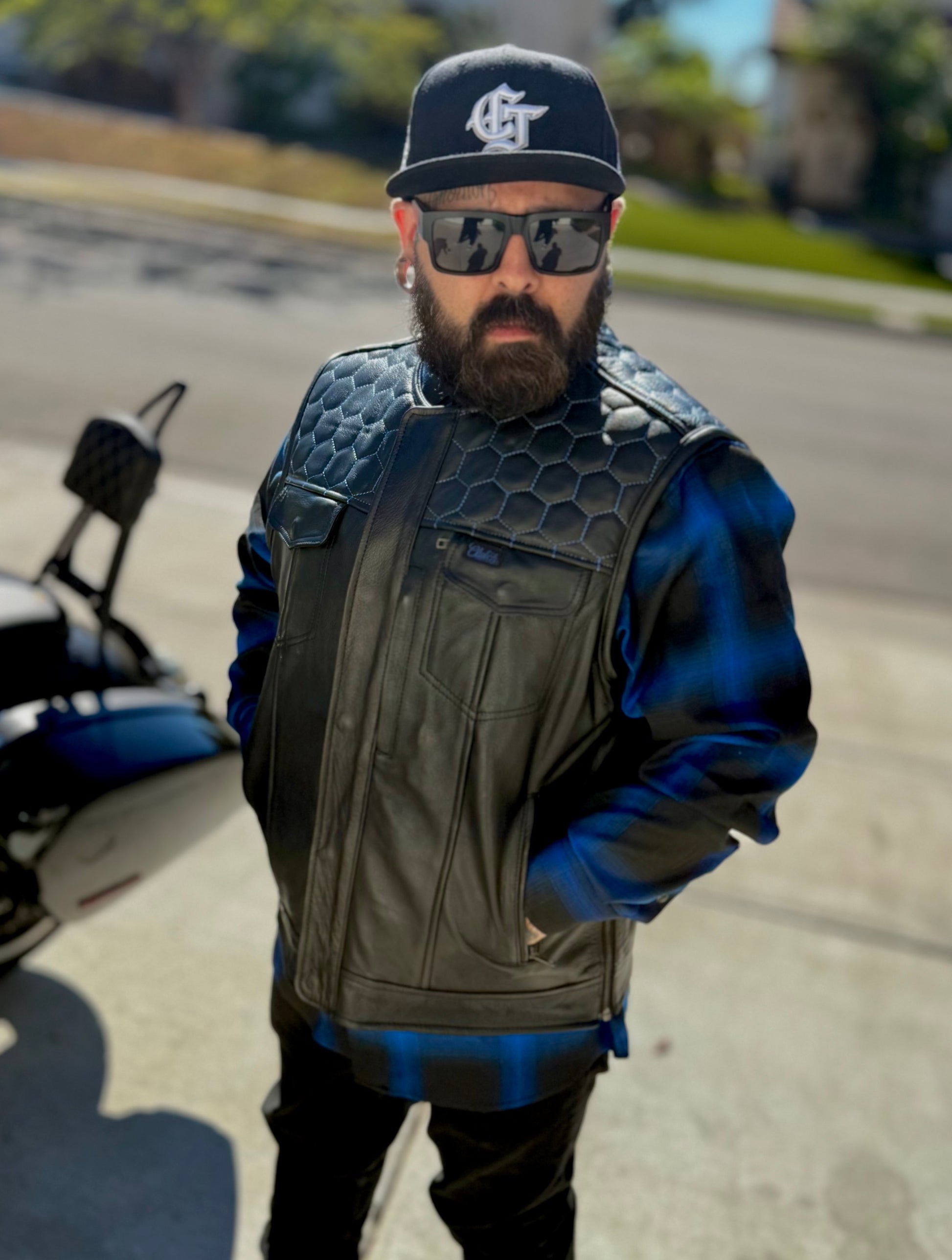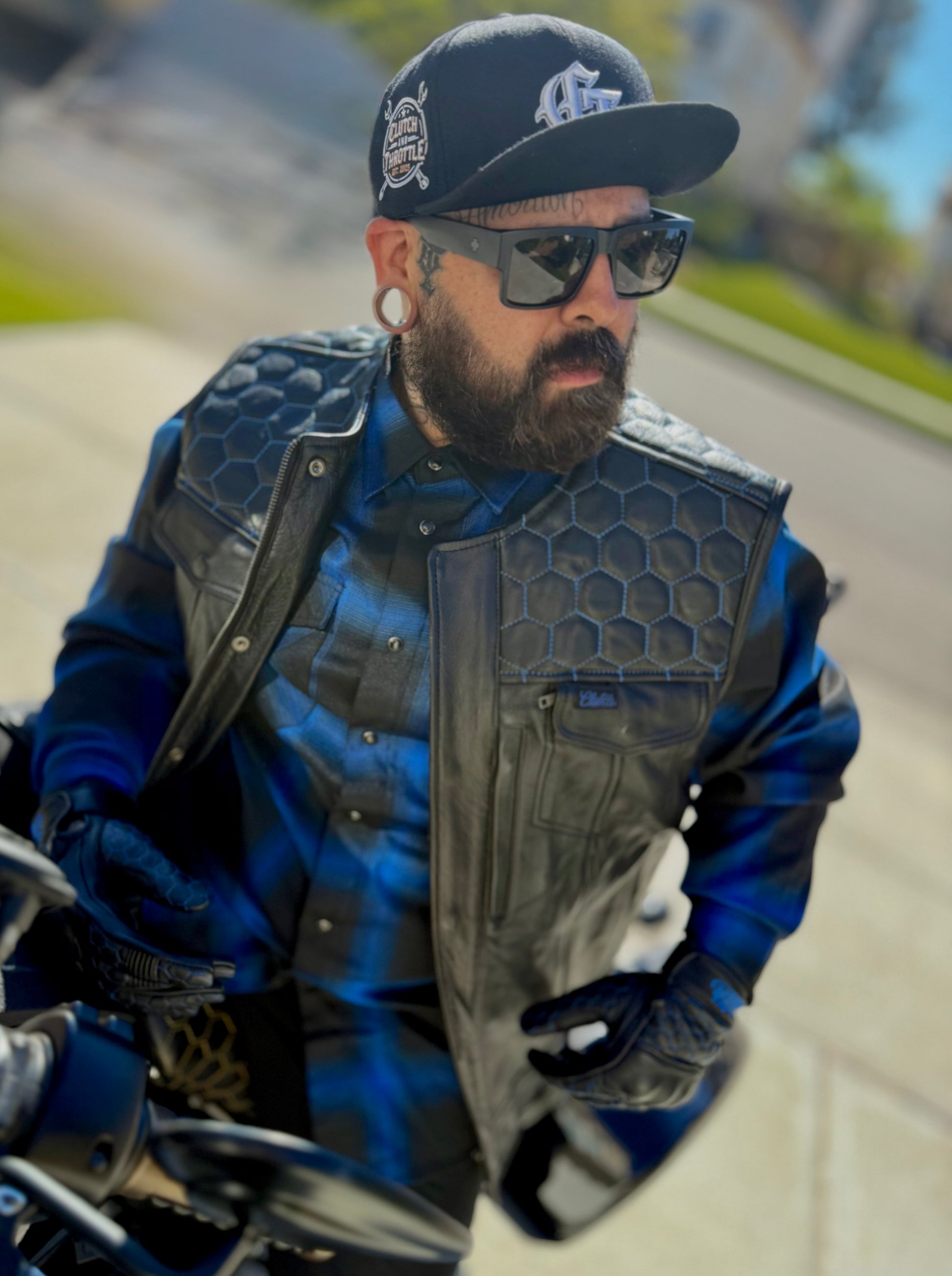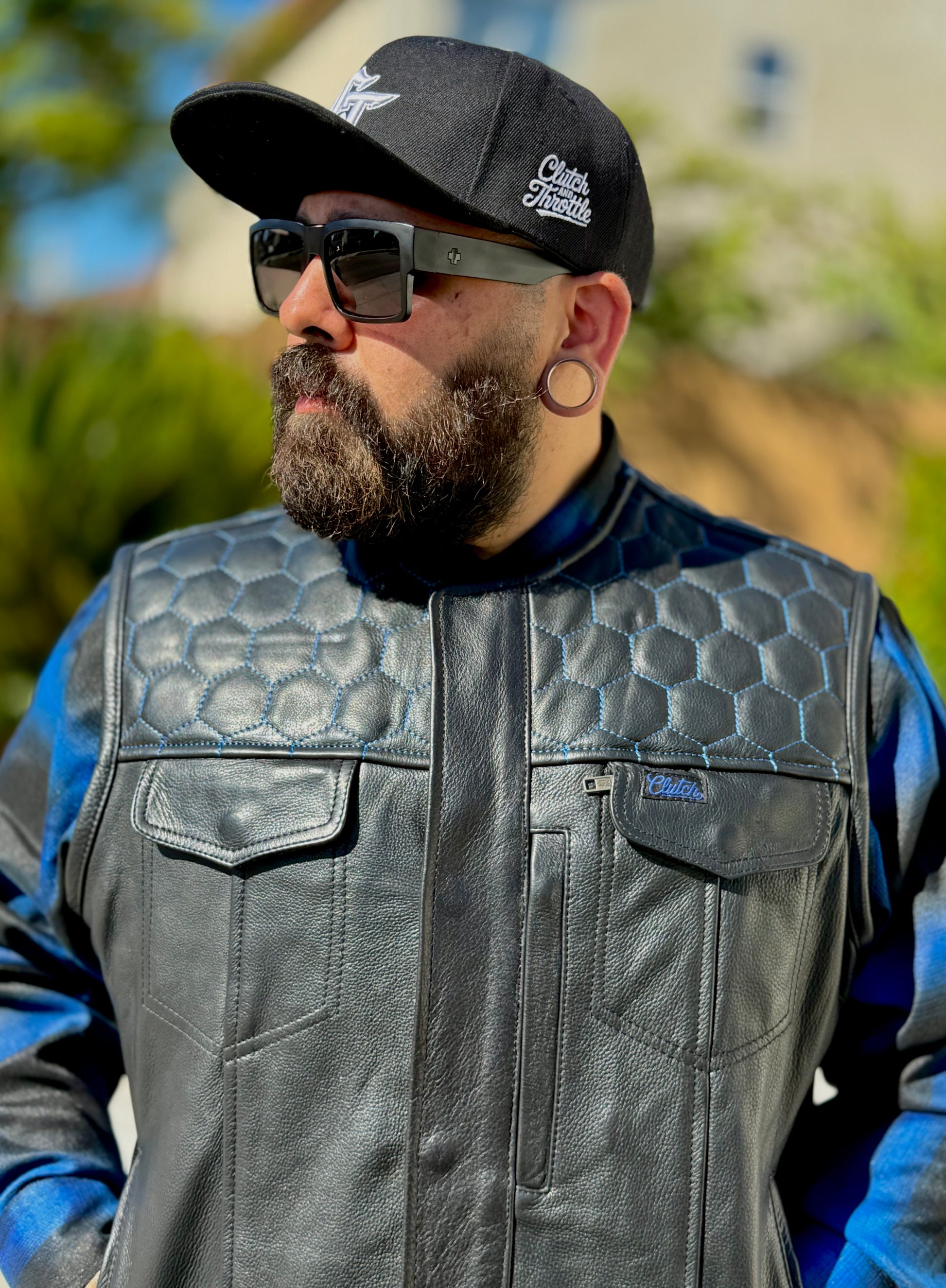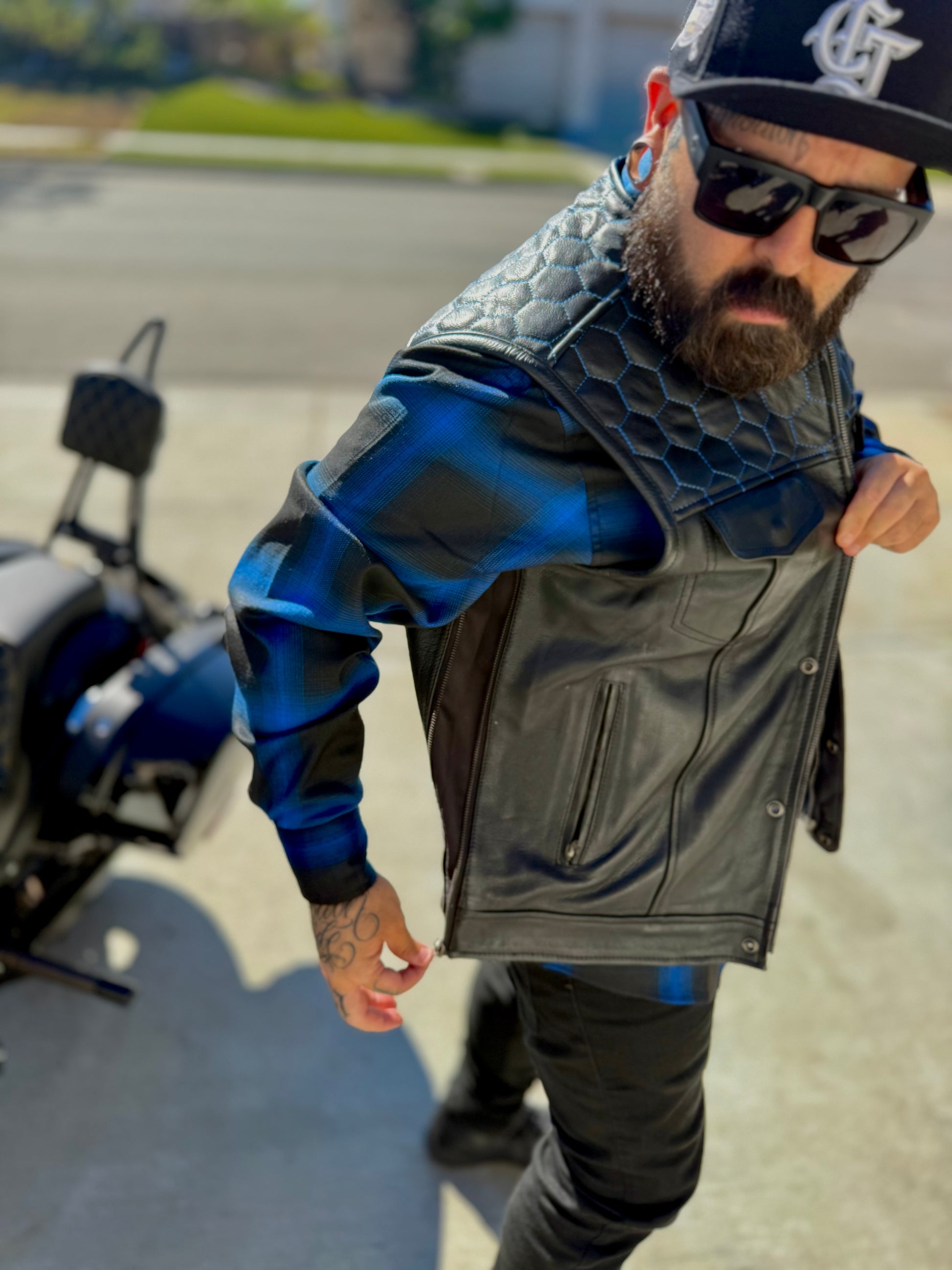 Ride the streets in the LARGE Azul Hornet Leather Vest and Glove set. Vest is lined with black interior and stamped with blue Clutch and Throttle logos alongside a paisley print. Blue honeycomb stitching stands out at any bike function!