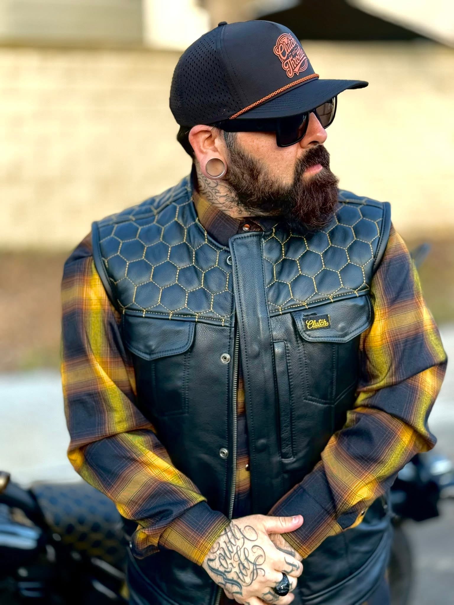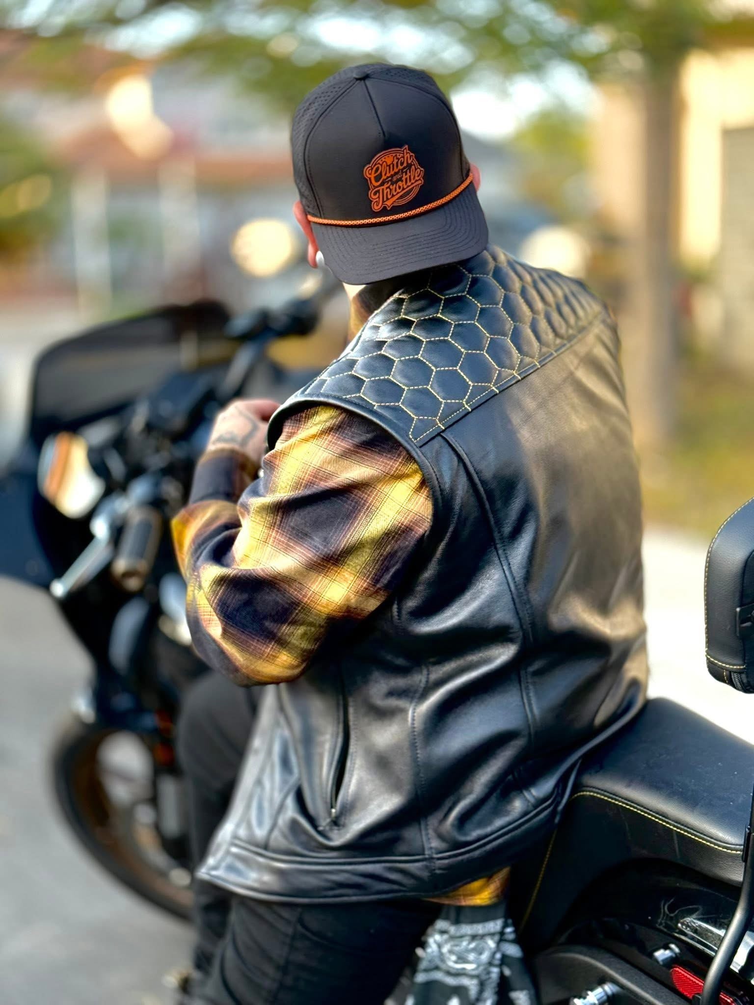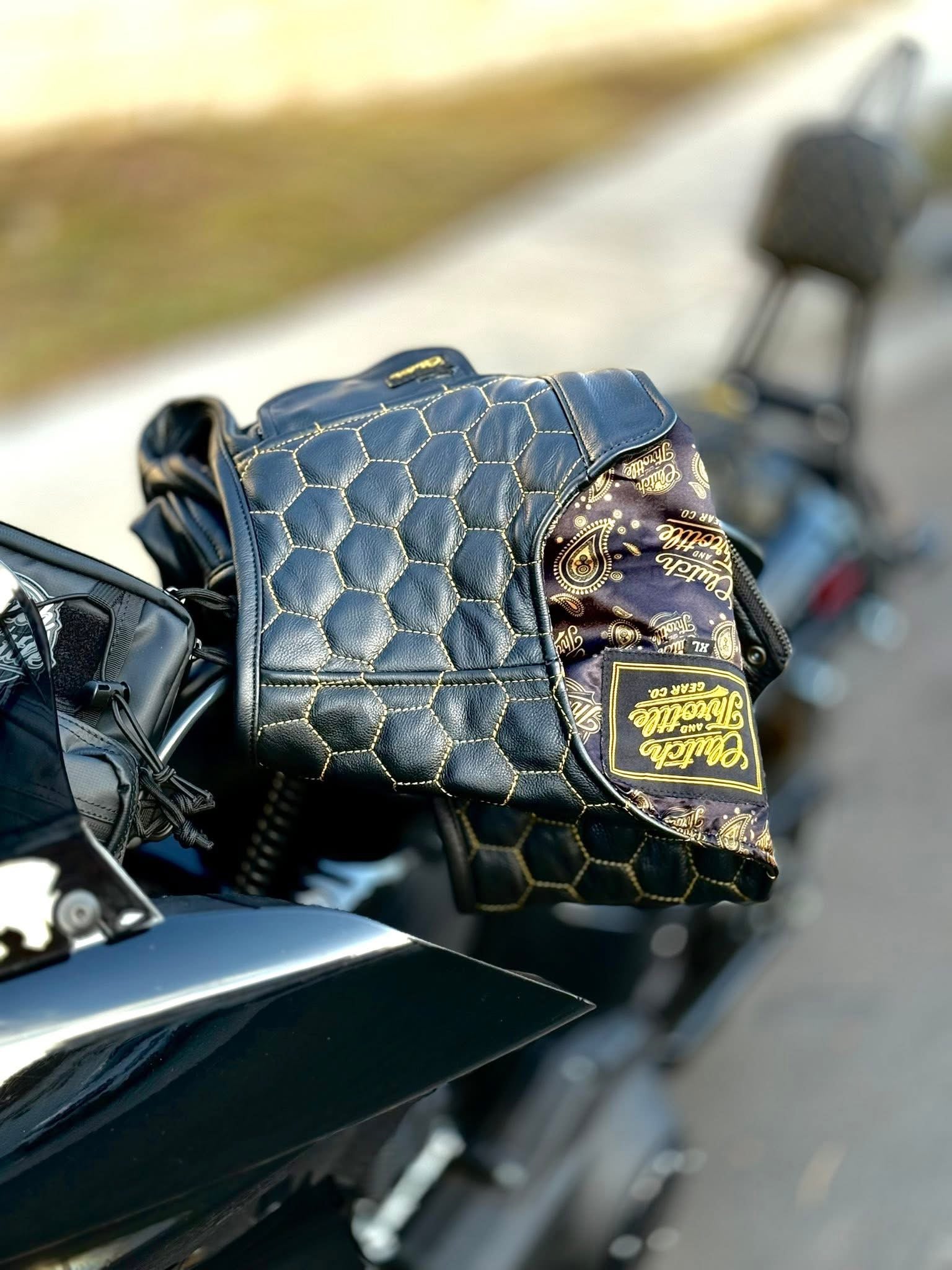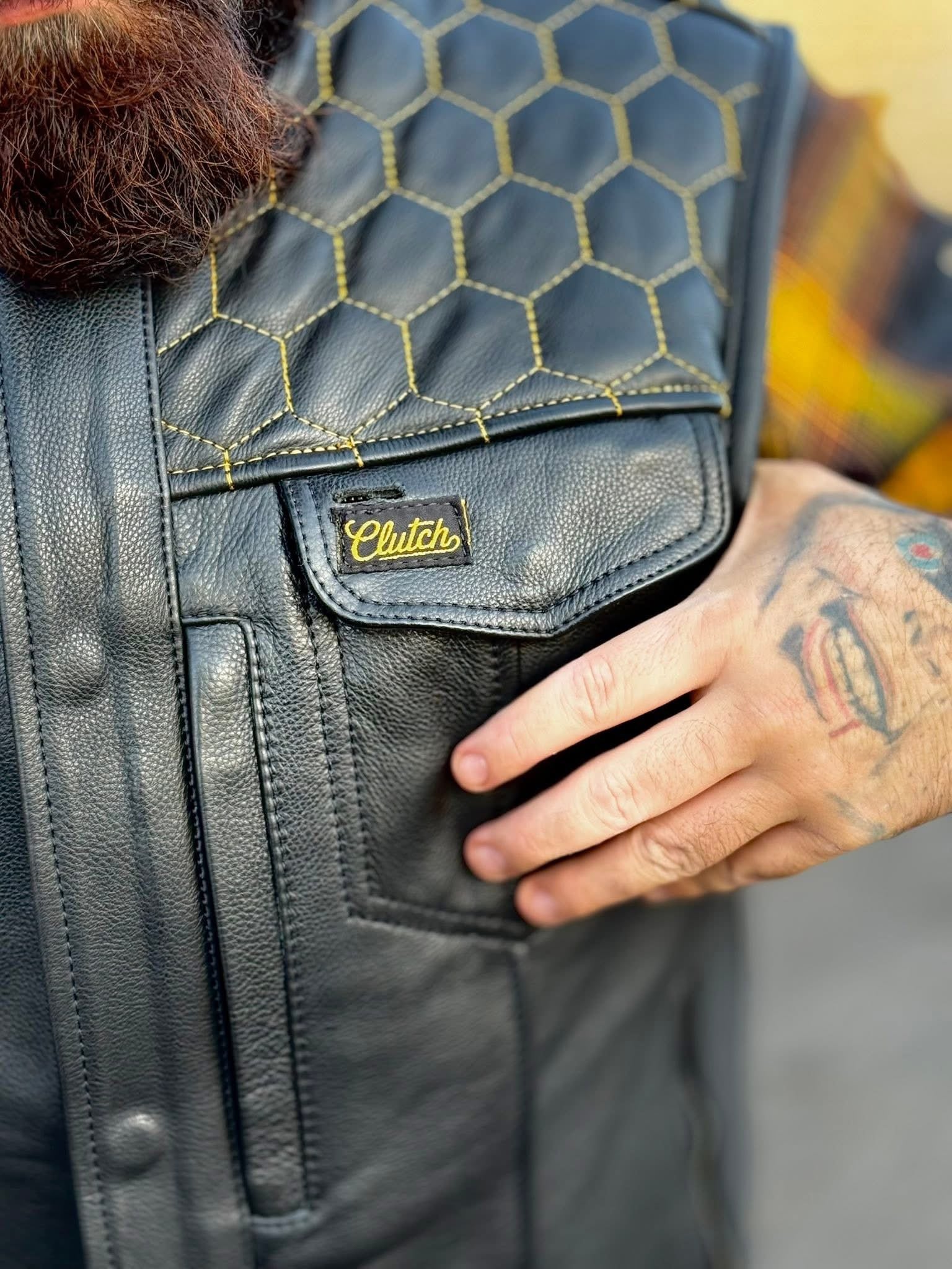 Ride the streets in the Golden Hornet Leather Vest. The vest is lined with black interior and stamped with yellow Clutch and Throttle logos alongside a paisley print. Golden honeycomb stitching stands out at any bike function!