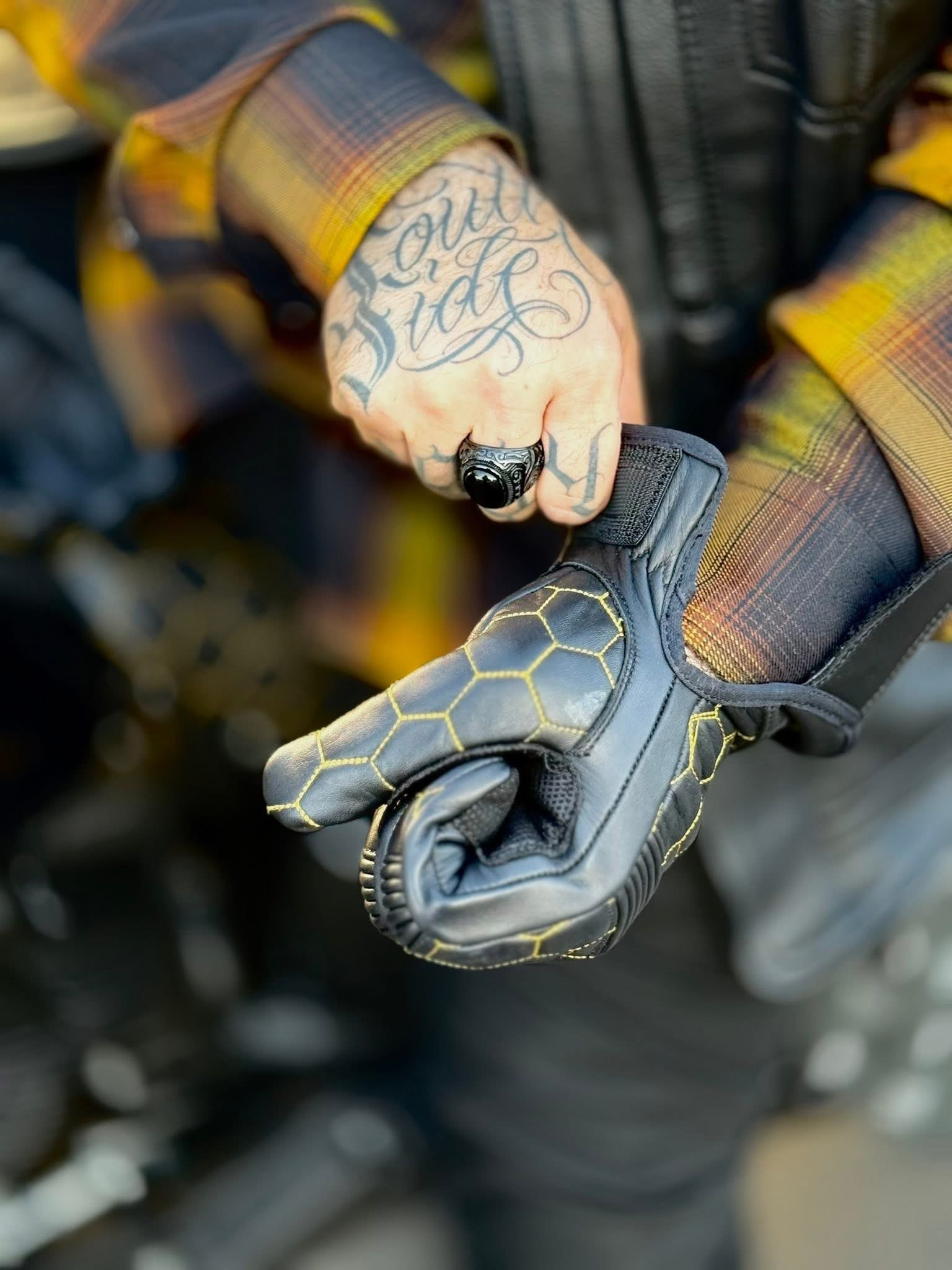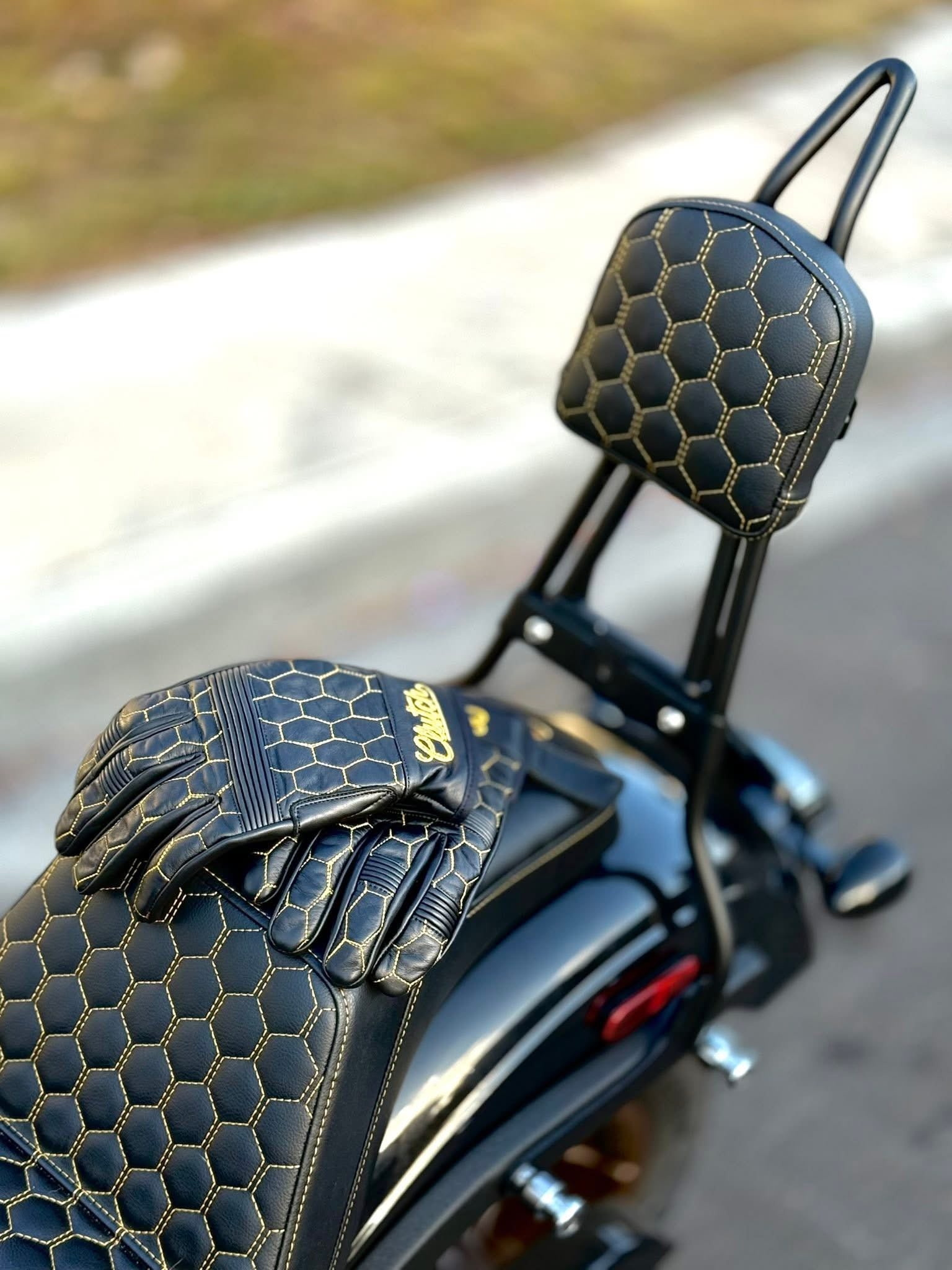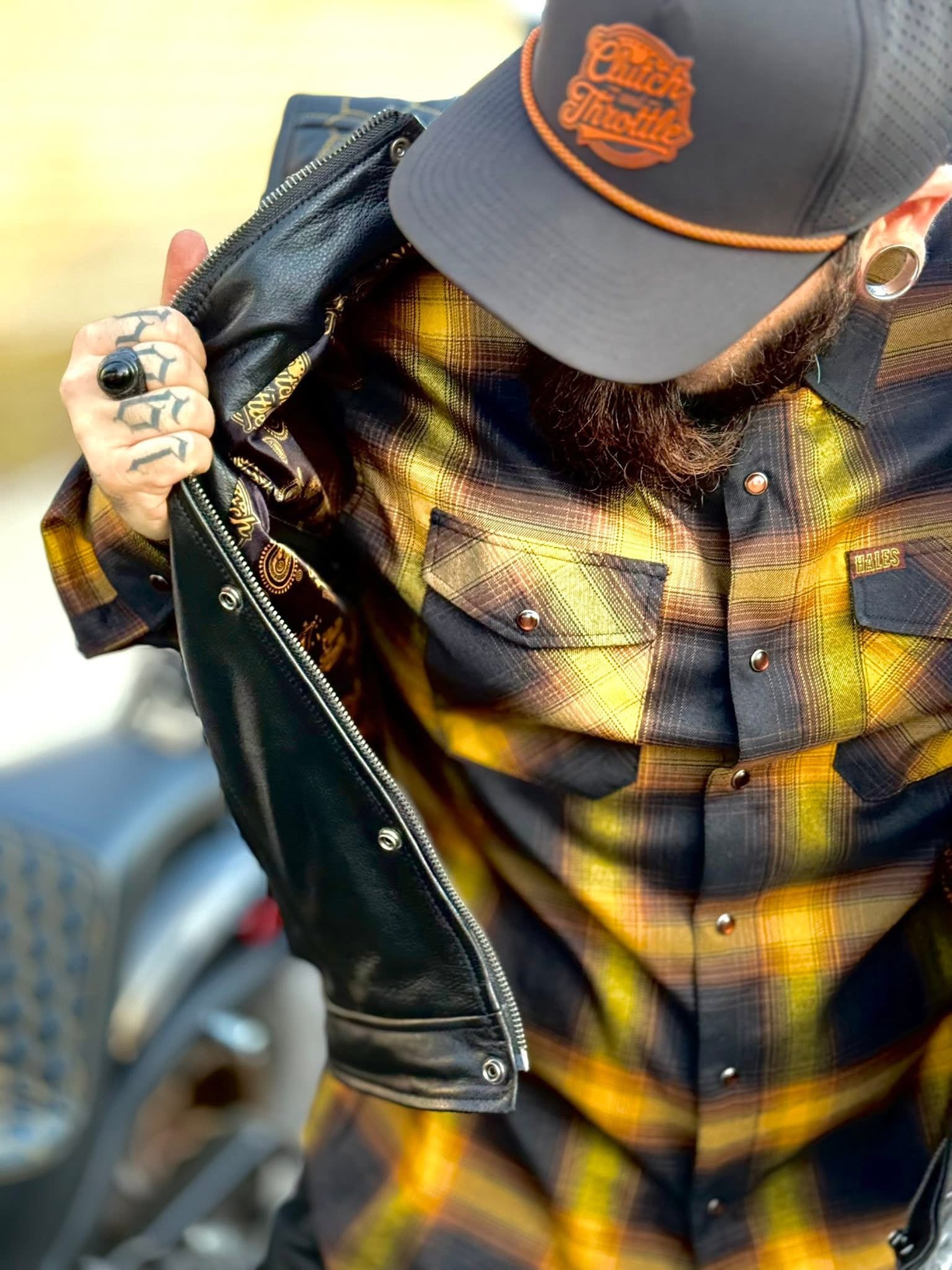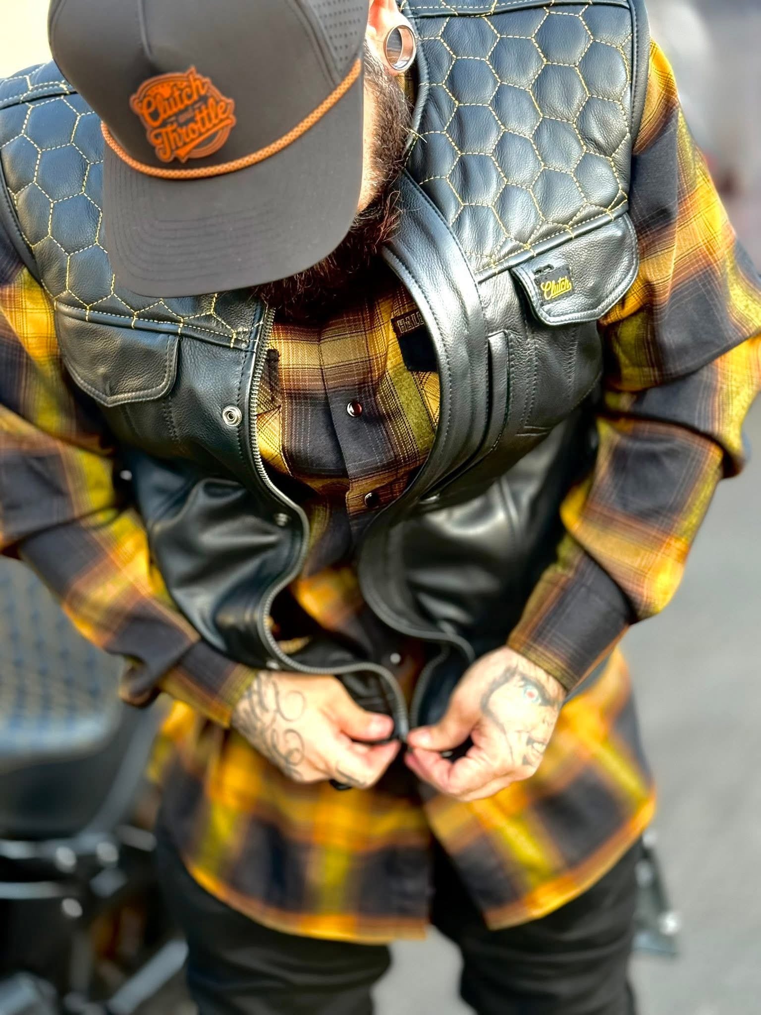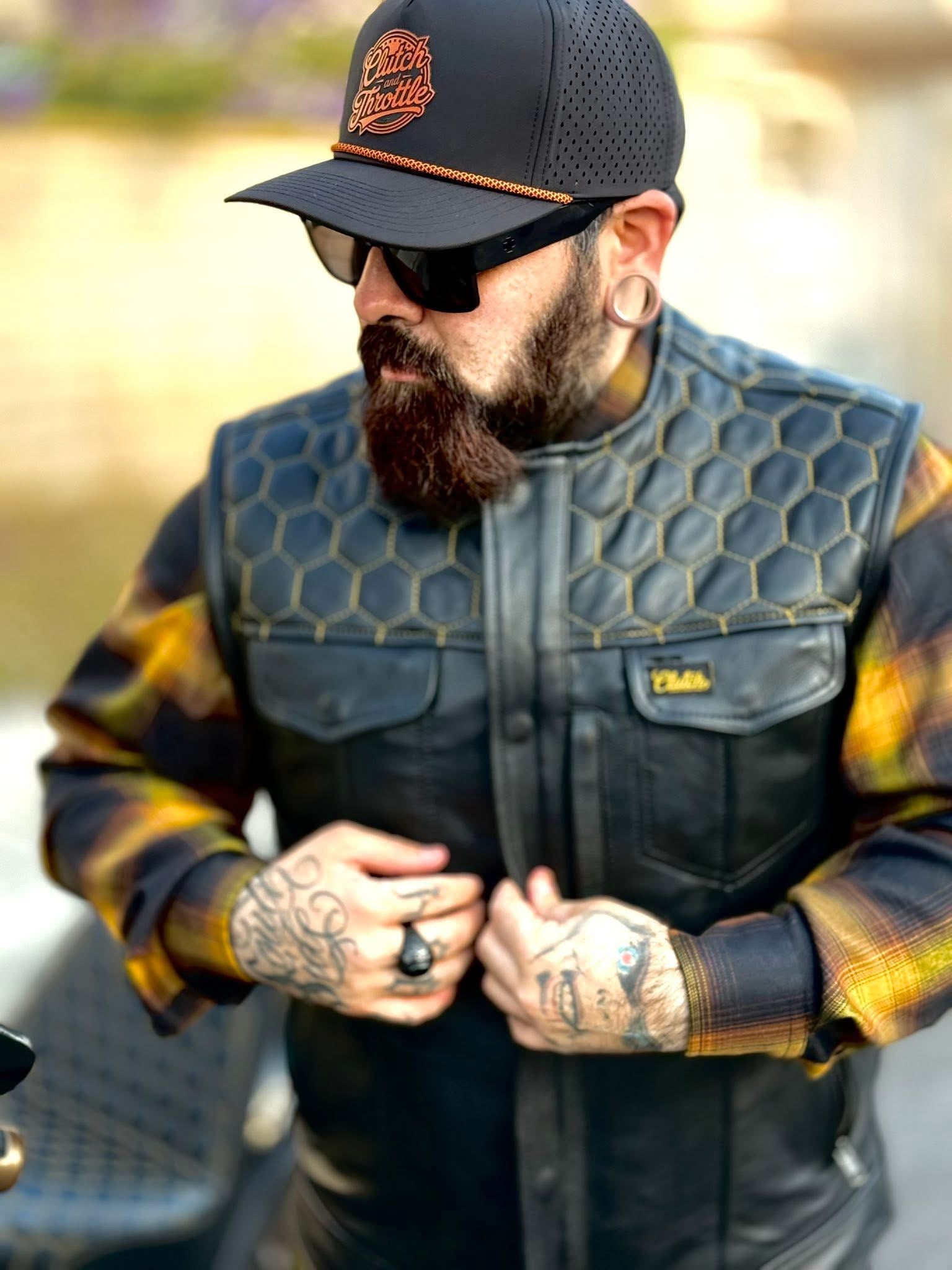 Ride the streets in the Golden Hornet Leather Vest. The vest is lined with black interior and stamped with yellow Clutch and Throttle logos alongside a paisley print. Golden honeycomb stitching stands out at any bike function!