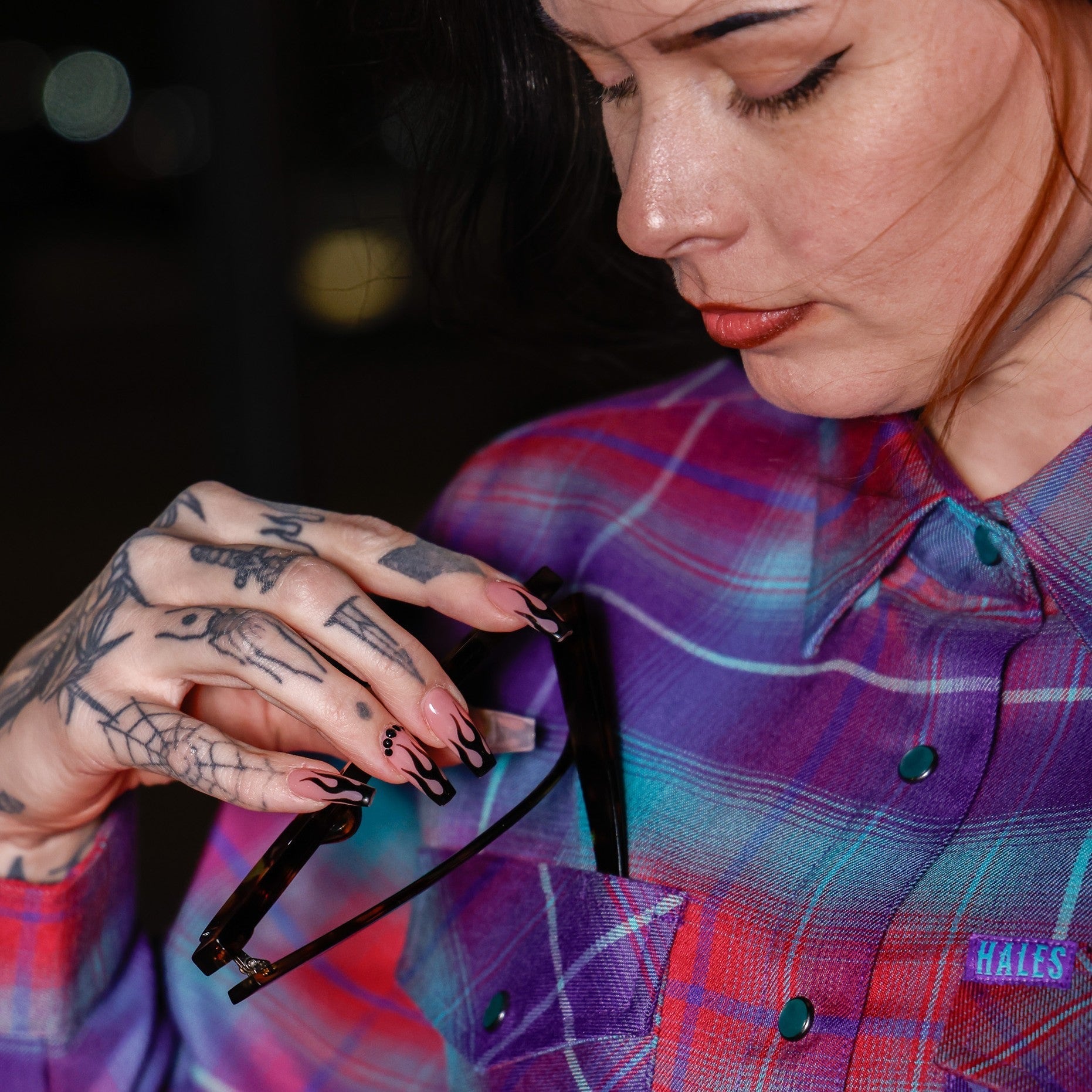 Meet the Mi Amor Flannel, because soft hearts can still ride hard. This one’s for the Valentine who’d rather twist a throttle than wait for roses to die. Deep purple, bold teal, and scarlet plaid collide in a look that’s equal parts passion, power, and don’t mess with me energy. The custom tag says it all: two sugar skulls locked in an eternal embrace, serving love that’s fearless, forever, and a little bit dangerous.