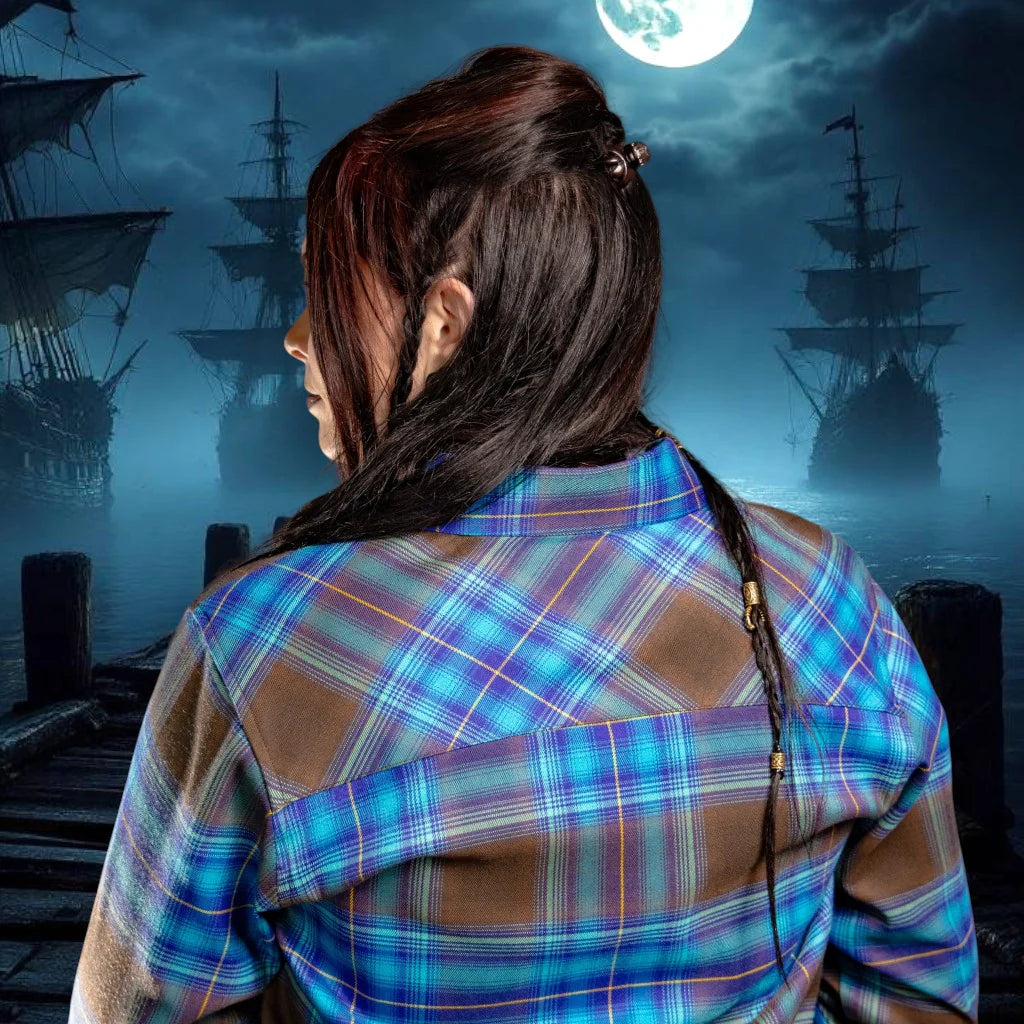 Step into the shadowed taverns of 17th-century Port Royal, where cutthroats and courtesans alike prowled moonlit docks for treasure and trouble. Our Women’s Port Royal Flannel drapes you in storm-tossed blues and weathered browns that mirror lantern-lit alleyways and salt-slick decks. Blue pearlized snaps catch the flicker of torchlight, and a tailored, feminine silhouette moves as freely as a corsair on the hunt. This isn’t just a shirt—it’s a piece of history, daring you to write your own legend.