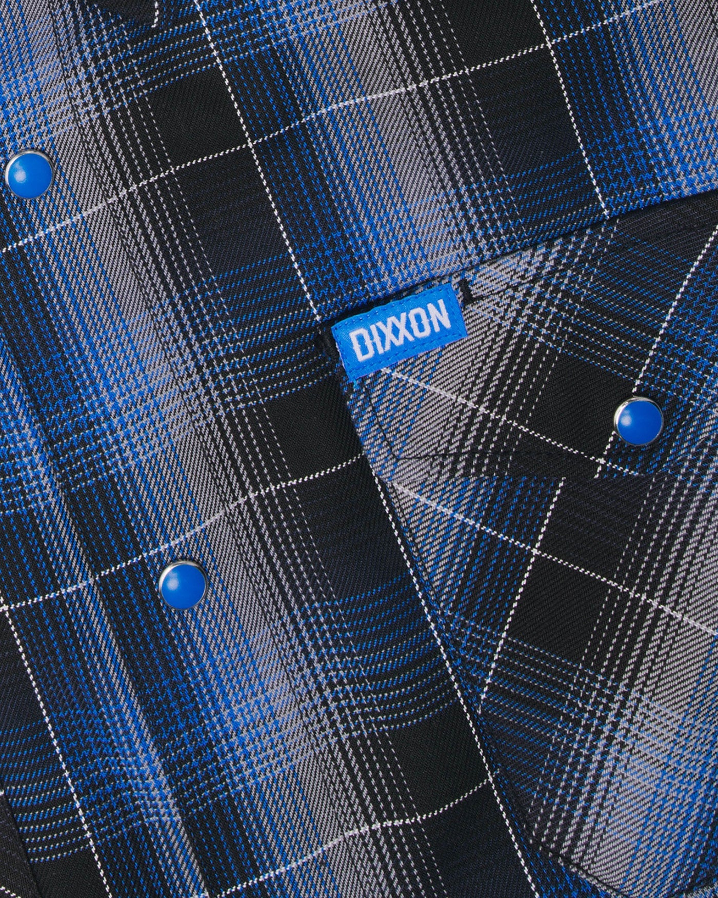 - Men’s flame resistant flannel shirt with a blue, black, gray, and white plaid pattern